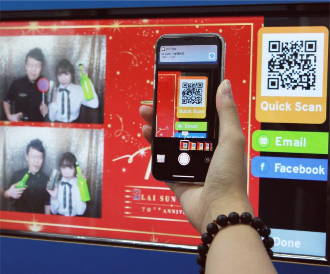 挑選道具,擺好姿勢,拍照後只需等待約12秒,即可取得與個人化相框結合的照片。Photobooth外觀亦可作不同裱貼,以突出你的品牌。
